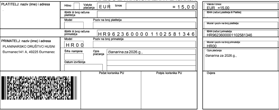 U prilogu je uplatnica za članarinu u PD Husni za 2026. godinu. Mole se članovi da uplate članarinu do 31. siječnja 2026. godine.