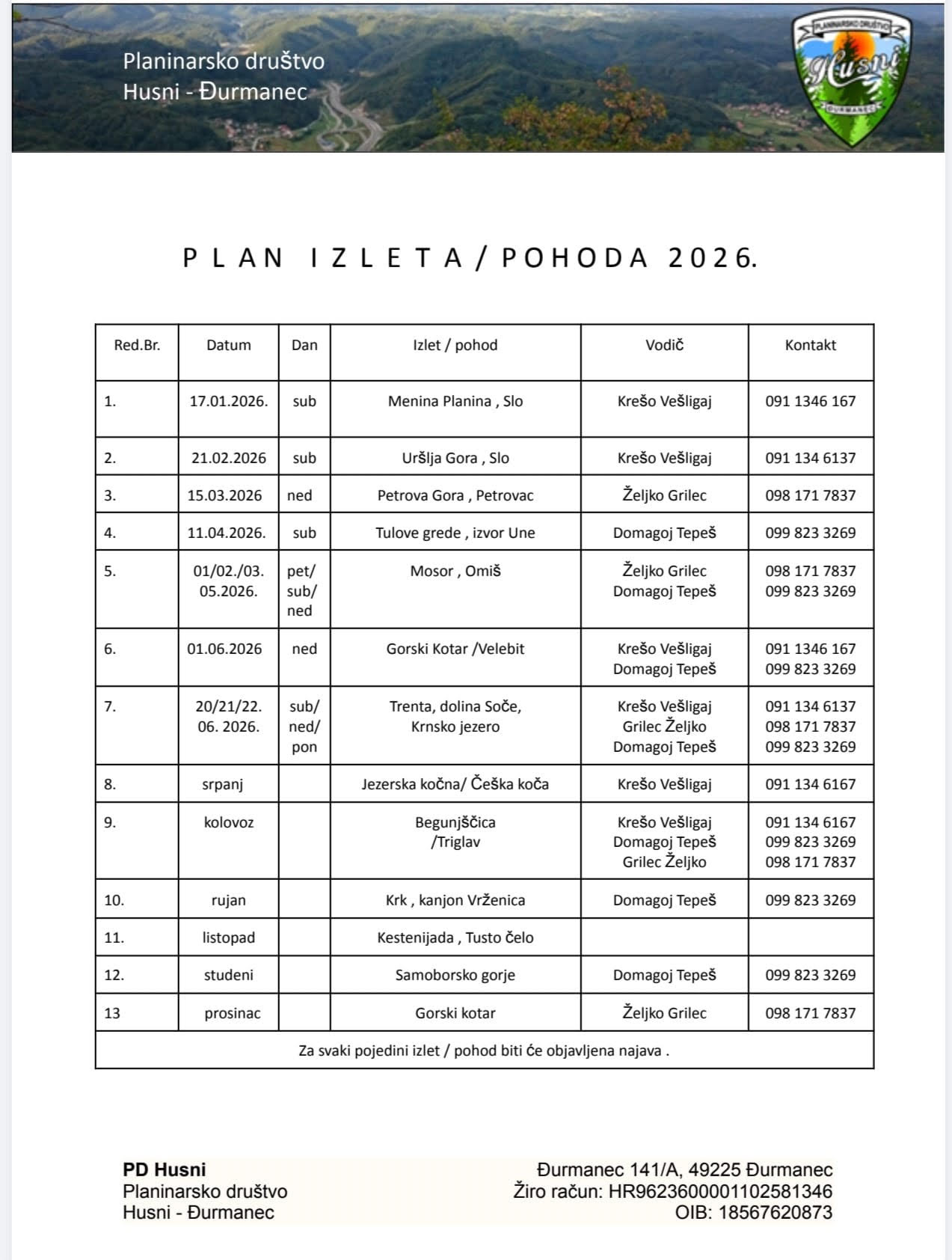 Detaljnije obavijesti o izletima bit će objavljene u našoj whatsapp zajednici PD Husni Đurmanec i u grupi na Facebooku.